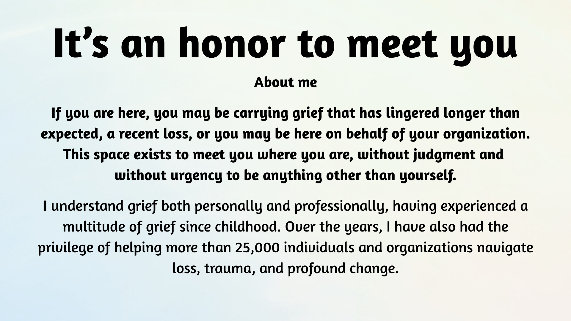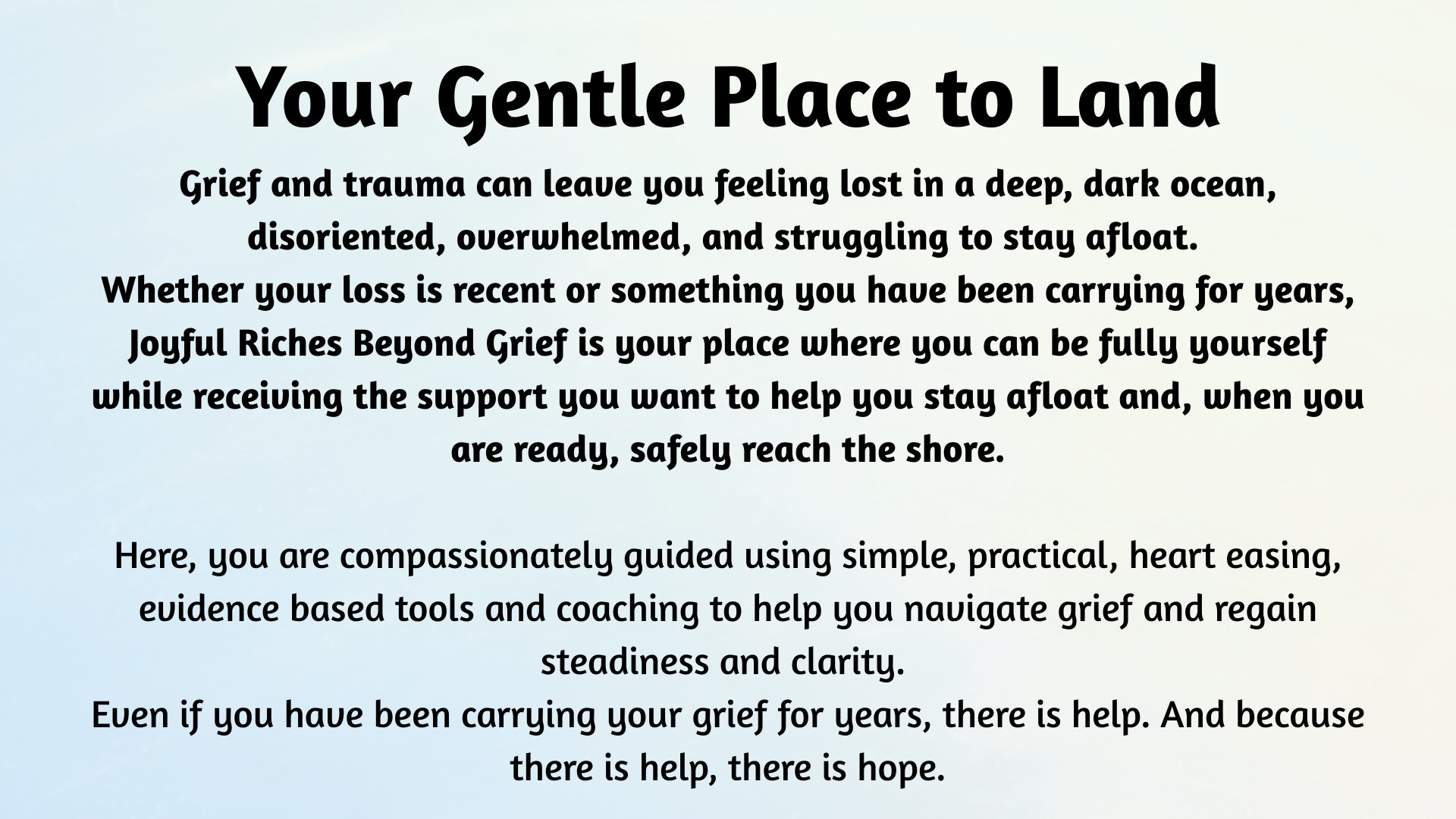 Whether your grief is recent or long standing, visible or private, involving your loss of a loved one, health, identity, life that changed unexpectedly, or the emotional impact experienced within teams, Joyful Riches Beyond Grief is your place to be heard, supported, and guided at a pace that feels safe for you.